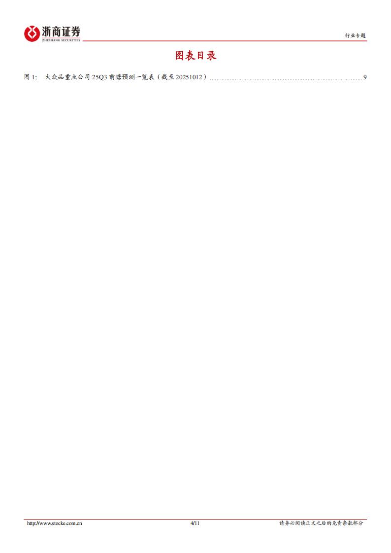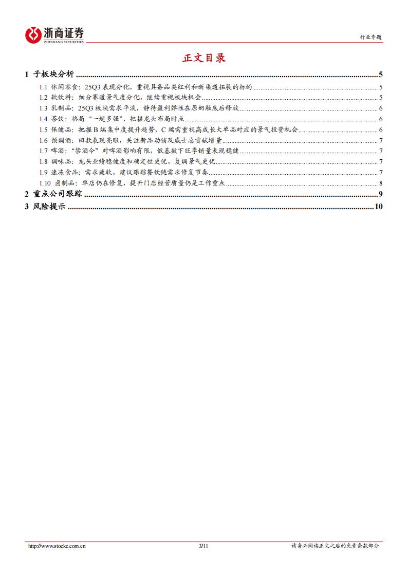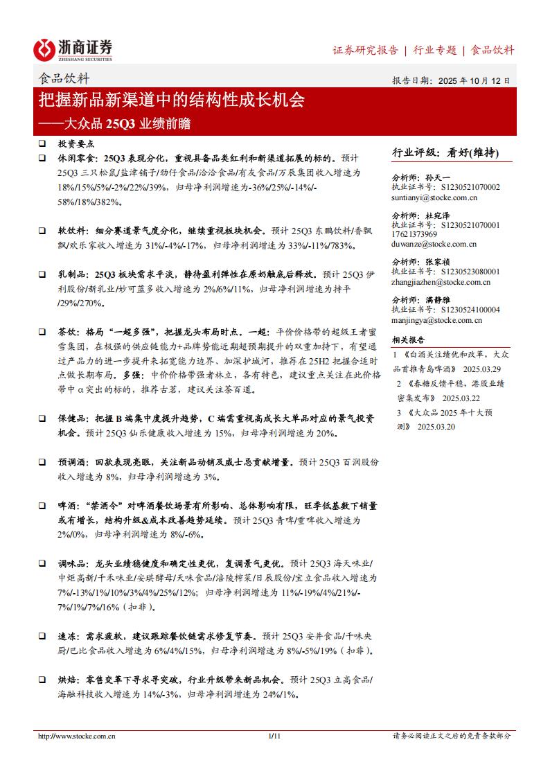 把握新品新渠道中的结构性成长机会——大众品25Q3业绩前瞻口 投资要点口 休闲零食:25Q3表现分化,重视具备品类红利和新渠道拓展的标的。预计25Q3三只松鼠/盐津铺子/劲仔食品/洽洽食品/有友食品/万辰集团收入增速为18%/15%/5%/-2%/22%/39%,归母净利润增速为-36%/25%/-14%/-58%/18%/382%。口 软饮料:细分赛道景气度分化,继续重视板块机会。预计25Q3东鹏饮料/香飘飘/欢乐家收入增速为31%/-4%/-17%,归母净利润增速为33%/-11%/783%。口 乳制品:25Q3板块需求平淡,静待盈利弹性在原奶触底后释放。预计25Q3伊利股份/新乳业/妙可蓝多收入增速为2%/6%/11%,归母净利润增速为持平/29%/270%。口 茶饮:格局“一超多强”,把握龙头布局时点。一超:平价价格带的超级王者蜜雪集团,在极强的供应链能力+品牌势能近期超预期提升的双重加持下,有望通过产品力的进一步提升来拓宽能力边界、加深护城河,推荐在25H2把握合适时点做长期布局。多强:中价价格带强者林立,各有特色,建议重点关注在此价格带中α突出的标的,推荐古茗,建议关注茶百道。口 保健品:把握B端集中度提升趋势,C端需重视高成长大单品对应的景气投资机会。预计25Q3仙乐健康收入增速为15%,归母净利润增速为20%。口 预调酒:回款表现亮眼,关注新品动销及威士忌贡献增量。预计25Q3百润股份收入增速为8%,归母净利润增速为3%。口 啤酒:“禁酒令”对啤酒餐饮场景有所影响、总体影响有限,旺季低基数下销量或有增长,结构升级&成本改善趋势延续。预计25Q3青啤/重啤收入增速为2%/0%,归母净利润增速为8%/-6%。口 调味品:龙头业绩稳健度和确定性更优,复调景气更优。预计25Q3海天味业/中炬高新/千禾味业/安琪酵母/天味食品/涪陵榨菜/日辰股份/宝立食品收入增速为7%/-13%/1%/10%/3%/4%/25%/12%;归母净利润增速为11%/-19%/4%/21%/-7%/1%/7%/16%(扣非)。口 速冻:需求疲软,建议跟踪餐饮链需求修复节奏。预计25Q3安井食品/千味央厨/巴比食品收入增速为6%/4%/15%,归母净利润增速为8%/-5%/19%(扣非)。口 烘焙:零售变革下寻求寻突破,行业升级带来新品机会。预计25Q3立高食品/海融科技收入增速为14%/-3%,归母净利润增速为24%/1%。口 其他:预计25Q3百龙创园收入增速为20%,归母净利润增速为40%。