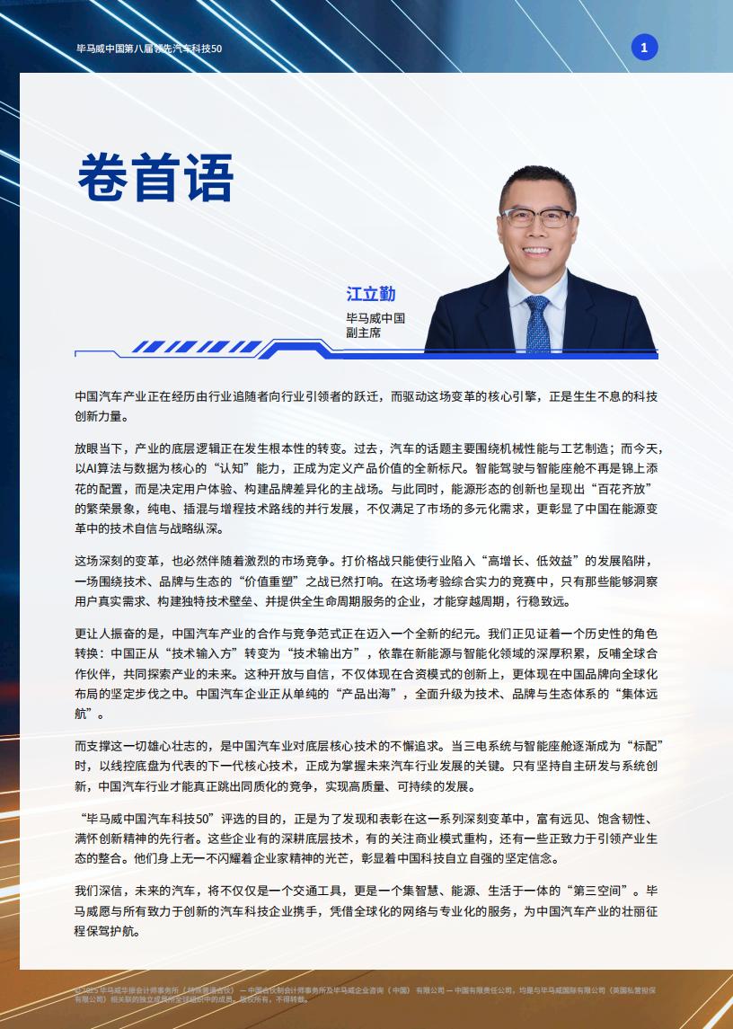 “毕马威中国汽车科技50”评选的目的,正是为了发现和表彰在这一系列深刻变革中,富有远见、饱含韧性、满怀创新精神的先行者。这些企业有的深耕底层技术,有的关注商业模式重构,还有一些正致力于引领产业生态的整合。他们身上无一不闪耀着企业家精神的光芒,彰显着中国科技自立自强的坚定信念。