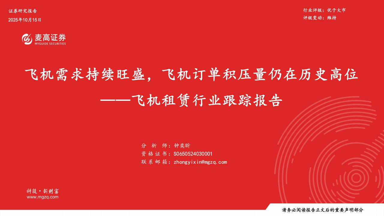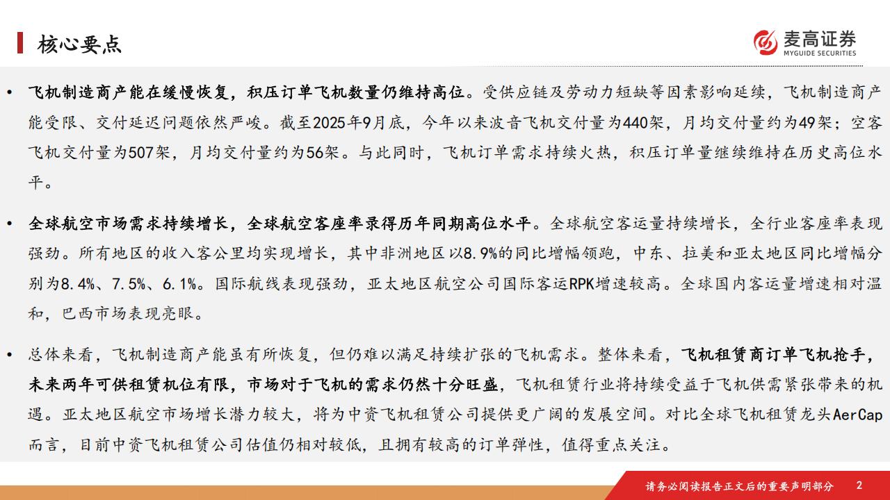 飞机制造商产能在缓慢恢复,积压订单飞机数量仍维持高位。受供应链及劳动力短缺等因素影响延续,飞机制造商产全球航空市场需求持续增长,全球航空客座率录得历年同期高位水平。全球航空客运量持续增长,全行业客座率表现总体来看,飞机制造商产能虽有所恢复,但仍难以满足持续扩张的飞机需求。整体来看,飞机租赁商订单飞机抢手,能受限、交付延迟问题依然严峻。截至2025年9月底,今年以来波音飞机交付量为440架,月均交付量约为49架;空客强劲。所有地区的收入客公里均实现增长,其中非洲地区以8.9%的同比增幅领跑,中东、拉美和亚太地区同比增幅分未来两年可供租赁机位有限,市场对于飞机的需求仍然十分旺盛,飞机租赁行业将持续受益于飞机供需紧张带来的机飞机交付量为507架,月均交付量约为56架。与此同时,飞机订单需求持续火热,积压订单量继续维持在历史高位水别为8.4%、7.5%、6.1%。国际航线表现强劲,亚太地区航空公司国际客运RPK增速较高。全球国内客运量增速相对温遇。亚太地区航空市场增长潜力较大,将为中资飞机租赁公司提供更广阔的发展空间。对比全球飞机租赁龙头AerCap平。和,巴西市场表现亮眼。而言,目前中资飞机租赁公司估值仍相对较低,且拥有较高的订单弹性,值得重点关注。今年以来,波音飞机交付量较去年同期显著改善,空客飞机交付量略好于去年同期水平,两家头部飞机制造商交付水平远不及此前高位水平。截至2025年9月底,今年以来波音飞机交付量为440架,月均交付量约为49架;空客飞机交付量为507架,月均交付量约为56架。今年以来,波音和空客今年累计新订单数量分别为821架和610架,飞机需求仍然较高。