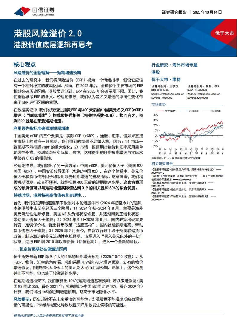 我们于2023年5月17日发布《港股市场估值要素研究-风险溢价:市场情绪晴雨表,左侧操作北极星》并推出国信海外港股风险溢价(ERP)模型。这个模型在2023-2024年运行良好:一方面回溯解释了2022年10月港股低位反弹、2023年1月高位回落等市场重要拐点;另一方面在后续的应用中成功识别出2023年末-2024年初的港股低点,以及2024年9月-2024年10月的行情始末。模型中ERP的具体算法如下: