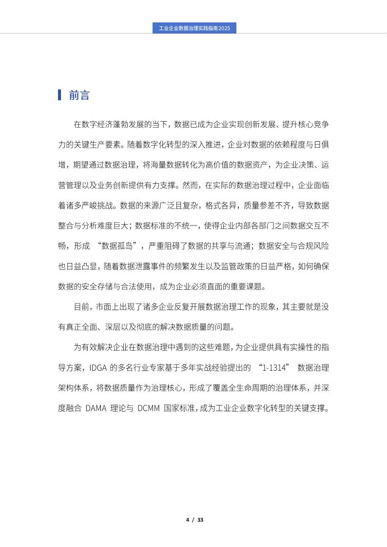为有效解决企业在数据治理中遇到的这些难题,为企业提供具有实操性的指导方案,IDGA的多名行业专家基于多年实战经验提出的“1-1314”数据治理架构体系,将数据质量作为治理核心,形成了覆盖全生命周期的治理体系,并深度融合DAMA理论与DCMM国家标准,成为工业企业数字化转型的关键支撑。