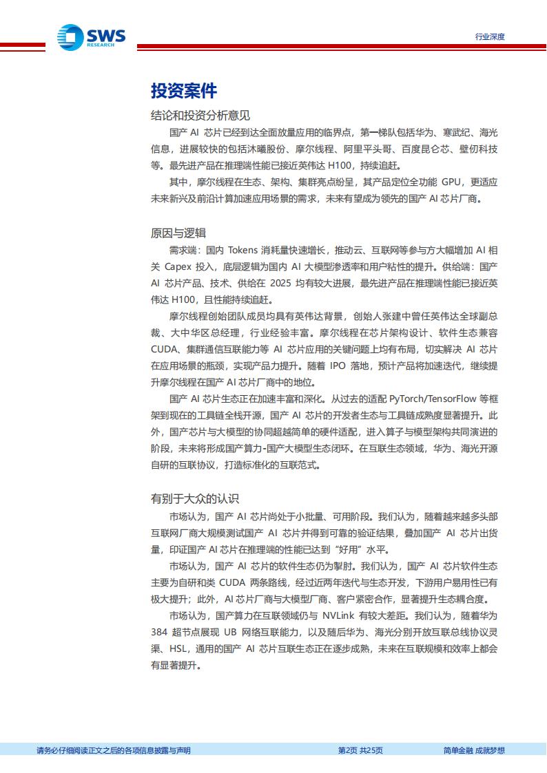 Capex增长,深层次体现出国内AI大模型渗透率和用户粘性的提升。供给侧:国产Al芯片产品、技术、供给在2025均有较大进展;最先进产品在推理端的性能已接近英伟达H100水平,持续追赶。