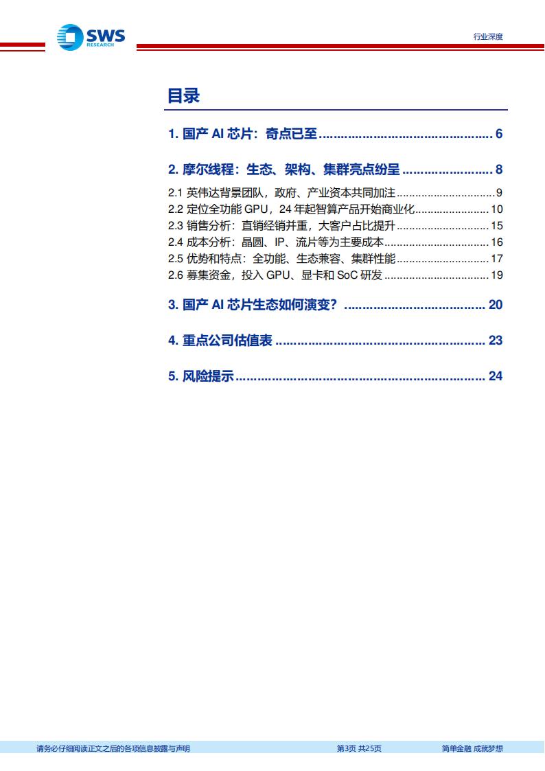 其中,摩尔线程在生态、架构、集群亮点纷呈,其产品定位全功能GPU,更适应未来新兴及前沿计算加速应用场景的需求,未来有望成为领先的国产AI芯片厂商。